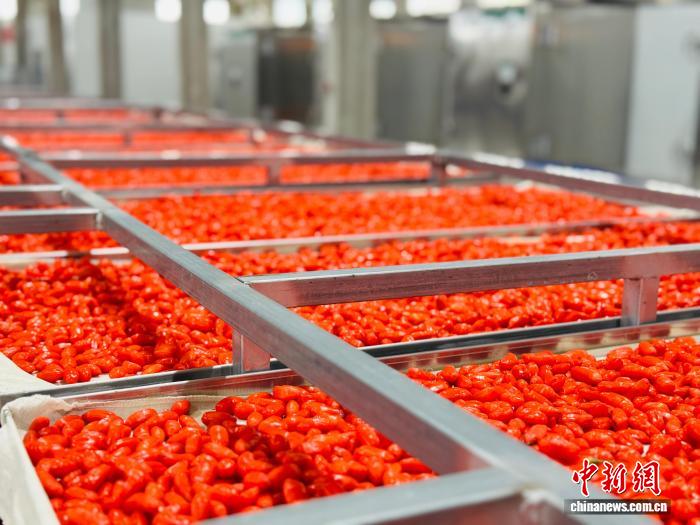 圖為青海省格爾木農(nóng)墾集團枸杞生產(chǎn)線,工人們正在收集采用鎖鮮工藝烘干的枸杞。孫睿 攝