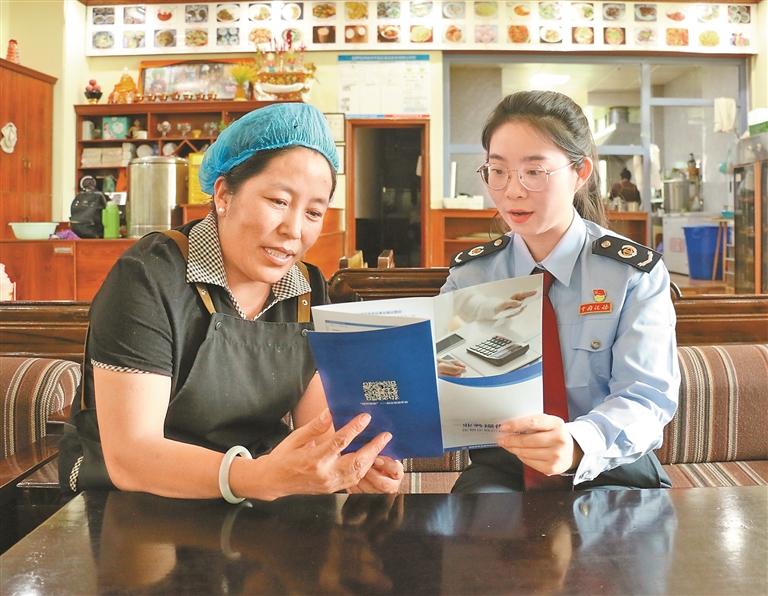 圖為稅務(wù)局工作人員為甜茶館經(jīng)營者講解線上開發(fā)票操作指南。