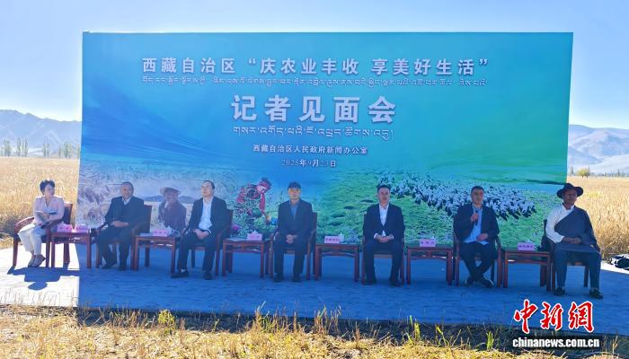 西藏自治區(qū)“慶農(nóng)業(yè)豐收享美好生活”記者見面會23日在拉薩市林周縣一片金黃的青稞田間舉行。西藏自治區(qū)農(nóng)業(yè)農(nóng)村廳二級巡視員米瑪次仁坐在發(fā)言席上,身后是山脈環(huán)繞的金色青稞田,遠(yuǎn)處聯(lián)合收割機(jī)轟鳴作業(yè)。他以詳實(shí)數(shù)據(jù)和親身經(jīng)歷,講述了西藏農(nóng)牧業(yè)60年的滄桑巨變。