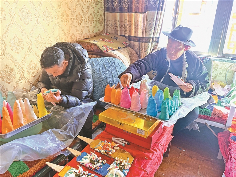 圖為羅布(右)和徒弟一起制作酥油花。通訊員 多吉卓瑪 旦增尼瑪 攝
