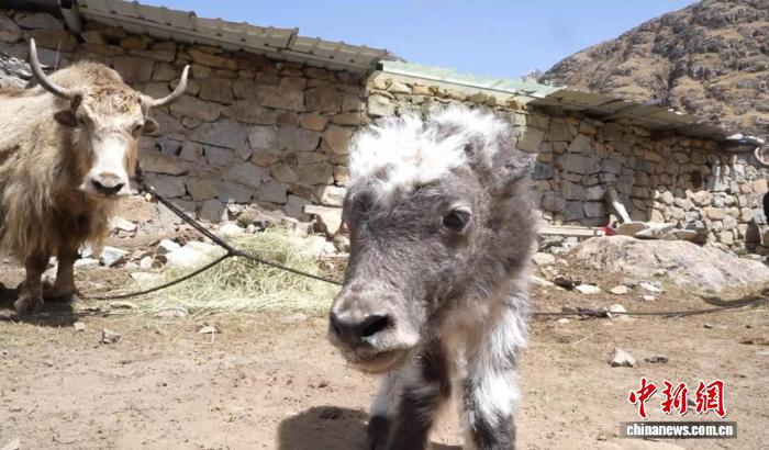 圖為三胞胎牦牛之一(右)?!”热缛诿焦﹫D