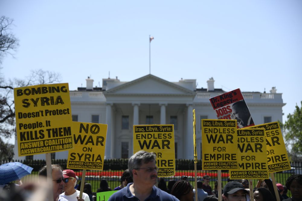 2018年4月14日,在美國(guó)華盛頓白宮北側(cè),人們手持標(biāo)語(yǔ)抗議對(duì)敘利亞進(jìn)行軍事打擊。新華社記者楊承霖?cái)z