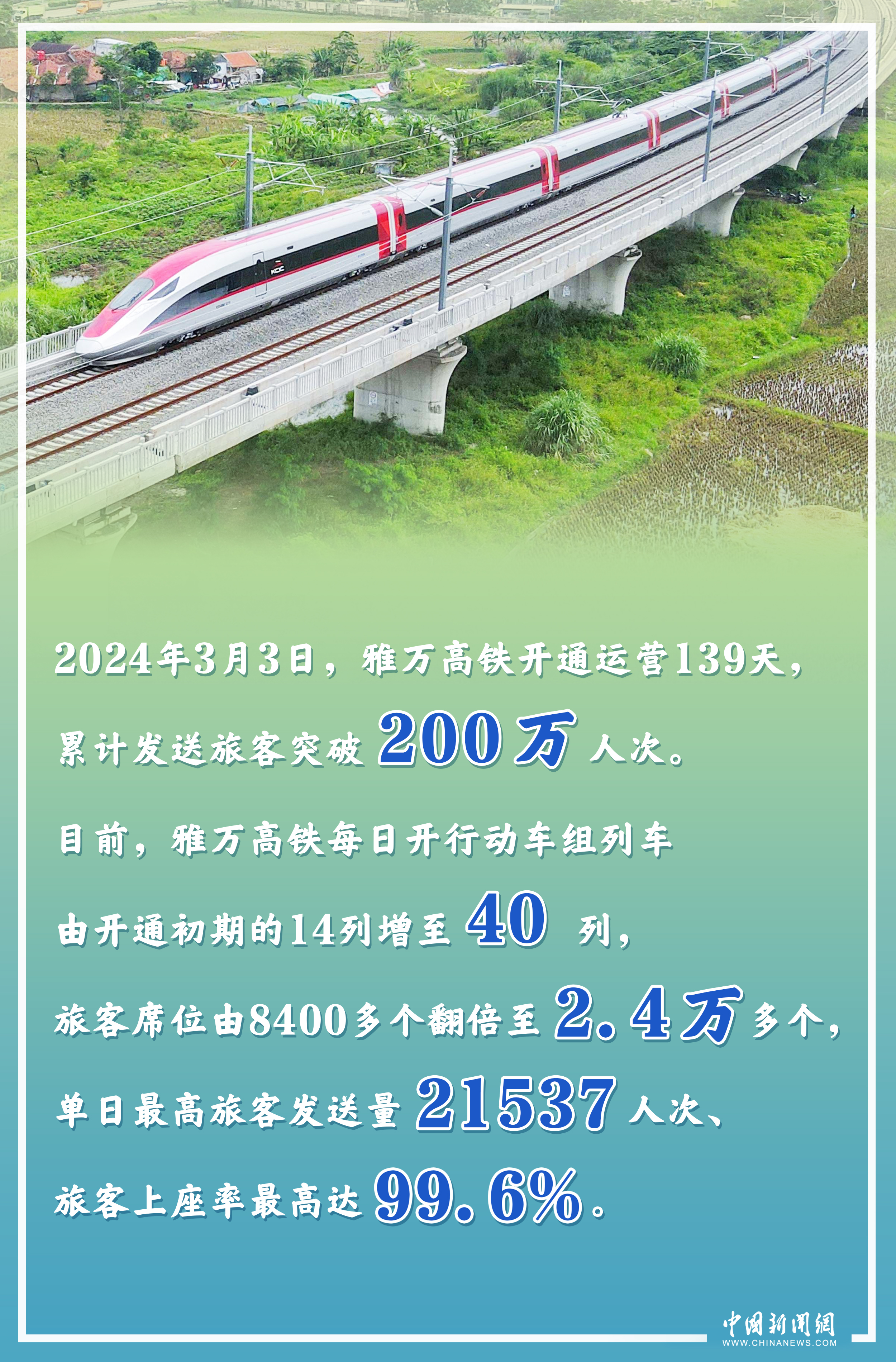 作為中國與印尼共建“一帶一路”的“金字招牌”,截至當?shù)貢r間2024年3月3日,印尼雅萬高鐵累計發(fā)送旅客突破200萬人次,單日旅客上座率最高達99.6%,客流持續(xù)保持高位態(tài)勢。