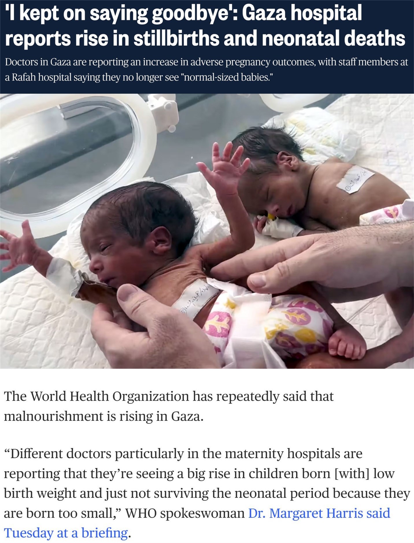 世界衛(wèi)生組織日前警告,加沙新生兒的死亡率正在直線上升。此外,還有大量嬰兒的體重達不到正常標準,導致他們過早夭折。
