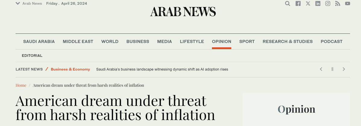 沙特阿拉伯媒體《阿拉伯新聞》網(wǎng)站4月24日刊發(fā)評論文章稱,美國通脹高企,物價不斷上漲,導致民眾的購買力持續(xù)下降,基本生活消費品成為無力負擔的“奢侈品”?!懊绹鴫簟北粴埧岬默F(xiàn)實擊潰。文章批評美國政府對通脹危機的反應嚴重不足,將黨派問題置于解決民眾的迫切需求之上,削弱了民眾的信任感。