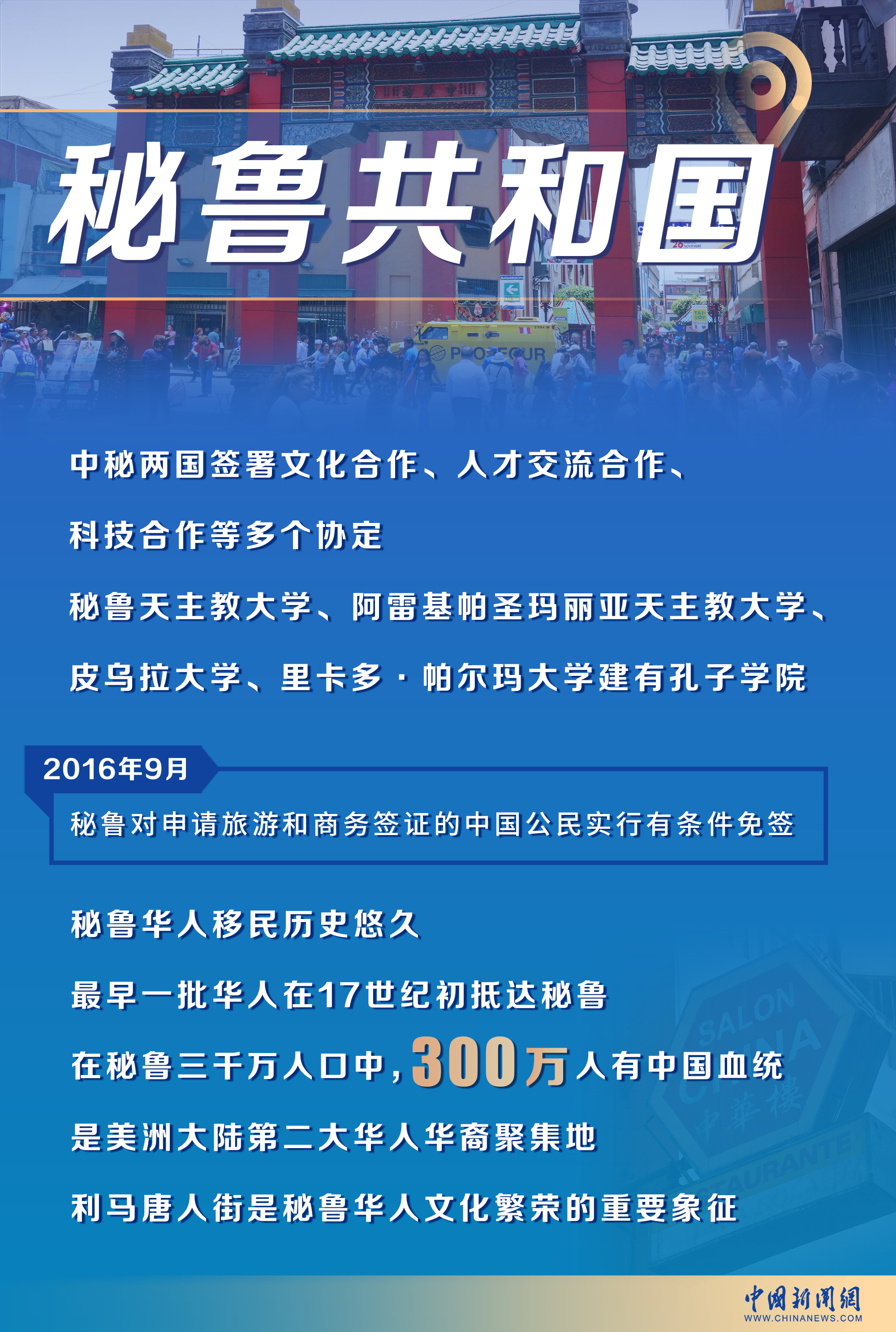 值得一提的是,秘魯是美洲華人移民歷史最悠久的國家之一。早在17世紀初,便已有華人抵達秘魯首都利馬。在秘魯?shù)娜f人口中,有三百萬人有著中國血統(tǒng),是美洲大陸僅次于美國的第二大華人與華裔聚集地。