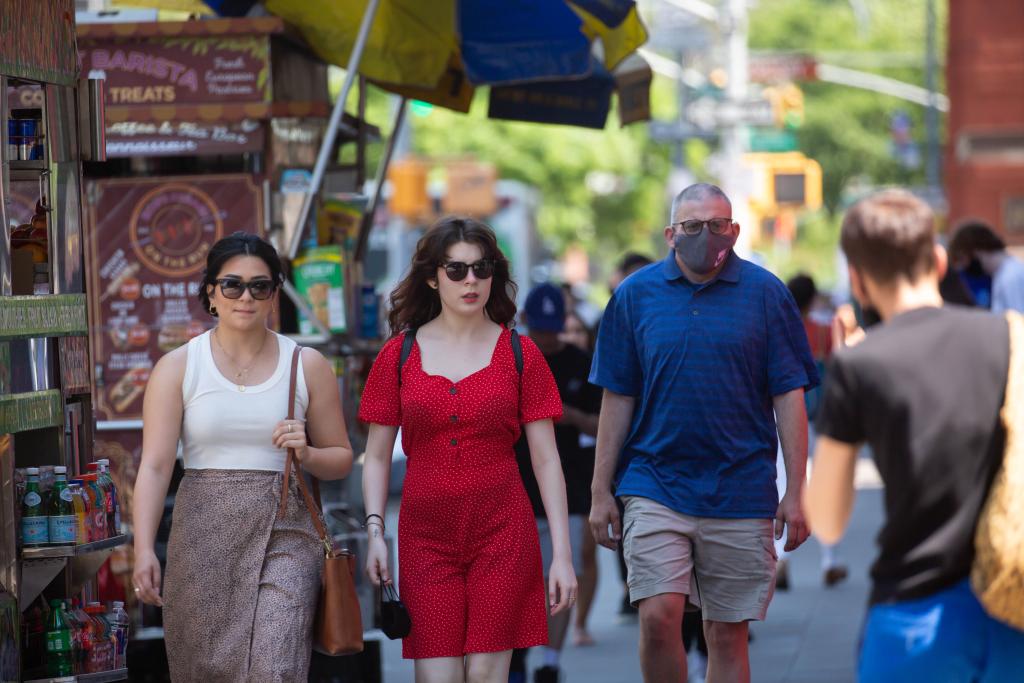 2021年5月19日,人們走在美國(guó)紐約街頭。新華社發(fā)(郭克攝)