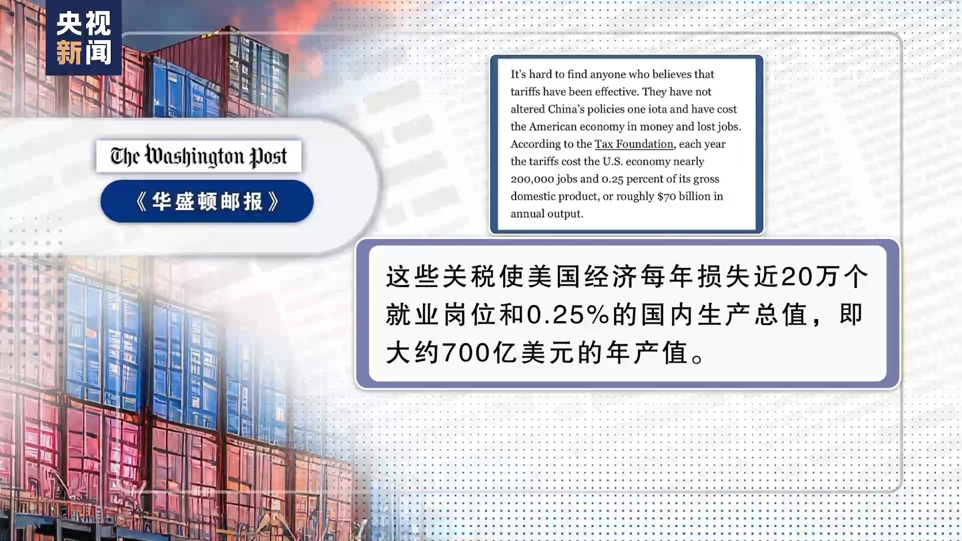另據(jù)美國《華盛頓郵報(bào)》4月援引美國稅務(wù)基金會(huì)的數(shù)據(jù),這些關(guān)稅使美國經(jīng)濟(jì)每年損失近20萬個(gè)就業(yè)崗位和0.25%的國內(nèi)生產(chǎn)總值,即大約700億美元的年產(chǎn)值。