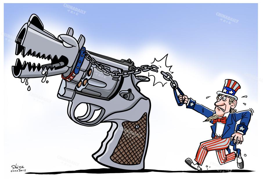 美國槍支如同“惡犬”,脫離掌控害人害己。(作者:中國日報(bào) 石宇)