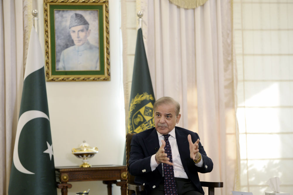 5月30日,巴基斯坦總理夏巴茲·謝里夫在首都伊斯蘭堡的總理府接受中國媒體聯(lián)合采訪。新華社發(fā)(艾哈邁德·卡邁勒攝)