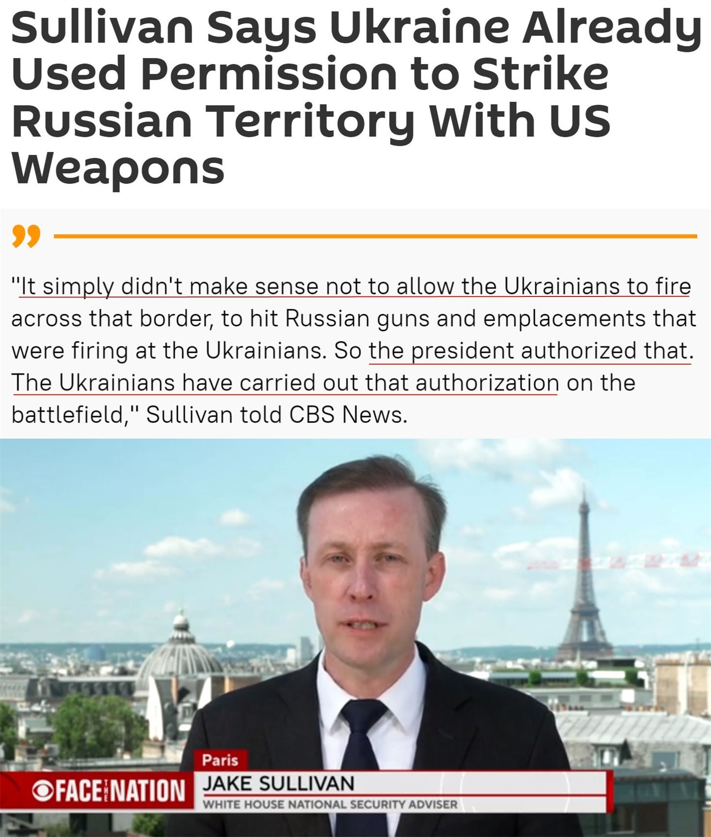 △俄羅斯衛(wèi)星通訊社:美國總統(tǒng)國家安全事務(wù)助理沙利文9日在接受美媒采訪時證實(shí),烏軍已經(jīng)使用美國提供的武器打擊俄羅斯本土目標(biāo)。