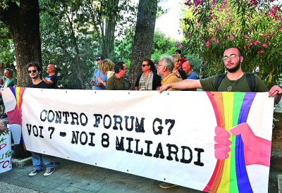 6月14日,在意大利法薩諾,抗議者打出“你們只有七個(gè),我們是八十億人”的標(biāo)語(yǔ),批評(píng)七國(guó)集團(tuán)與世界完全割裂。新華社記者 李京攝