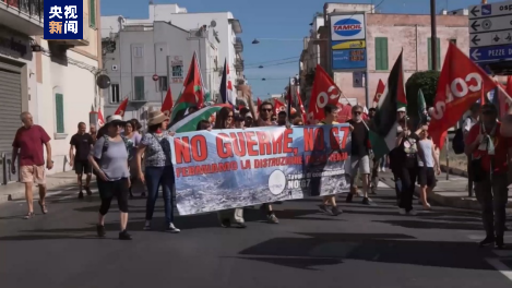 示威者在七國集團(tuán)峰會舉辦地法薩諾市舉著反對戰(zhàn)爭的標(biāo)語