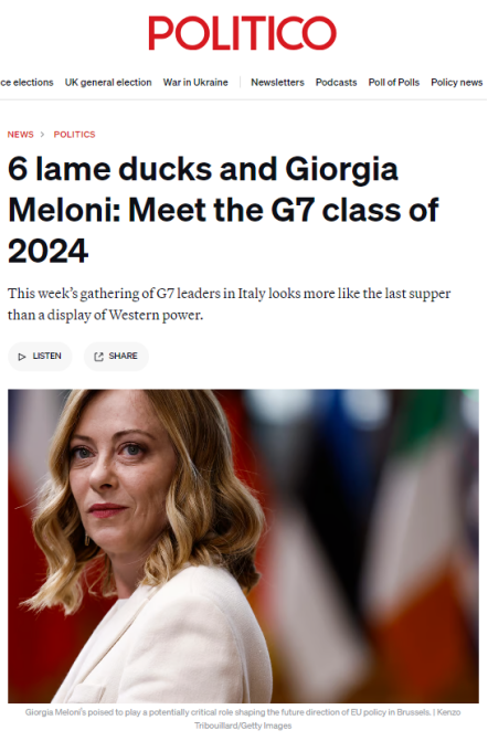 面對各自國內(nèi)嚴(yán)峻的政治形勢,本次G7峰會開得真有些力不從心、心猿意馬。法德兩國領(lǐng)導(dǎo)人所在政黨在上周剛剛結(jié)束的歐洲議會選舉中表現(xiàn)堪憂;英國首相蘇納克更在朝不保夕中擔(dān)憂著自己的保守黨會在下月初大選中走到窮途末路;美國總統(tǒng)拜登更是處處遭逢著大選對手特朗普的咄咄逼人。美國政客新聞網(wǎng)歐洲版(Politico.eu)捕捉到了這種有趣的心不在焉的會議氛圍,以《六只跛腳鴨和梅洛尼》為題諷刺總結(jié)本次峰會,“在意大利舉行的七國集團(tuán)峰會看起來更像是最后的晚餐,而不是西方力量的展示”。