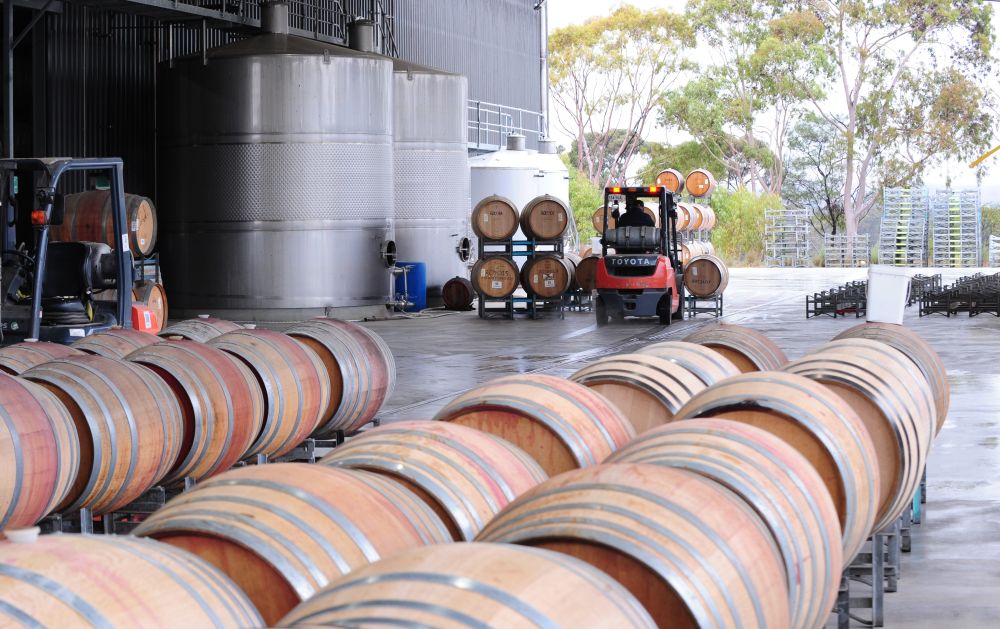 ↑5月30日,在澳大利亞巴羅薩谷,特思納酒莊員工在倉庫搬運葡萄酒桶。