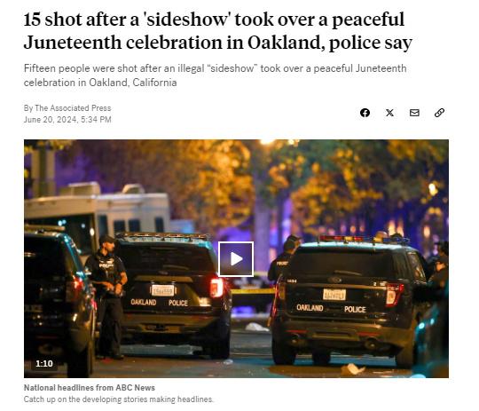 據(jù)報(bào)道,奧克蘭警方表示,槍擊事件發(fā)生在該市舉行的一場(chǎng)未經(jīng)批準(zhǔn)的六月節(jié)慶?;顒?dòng)期間。有人踩上一輛汽車引擎蓋引發(fā)斗毆,進(jìn)而發(fā)生槍擊事件。