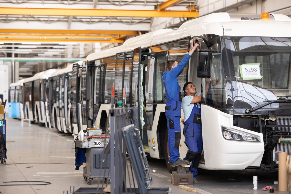 6月14日,在斯洛文尼亞馬里博爾郊區(qū)的TAM歐洲商用車研發(fā)制造公司工廠,工人在電動巴士生產(chǎn)線上工作。新華社發(fā)(澤利科·斯特凡尼奇攝)