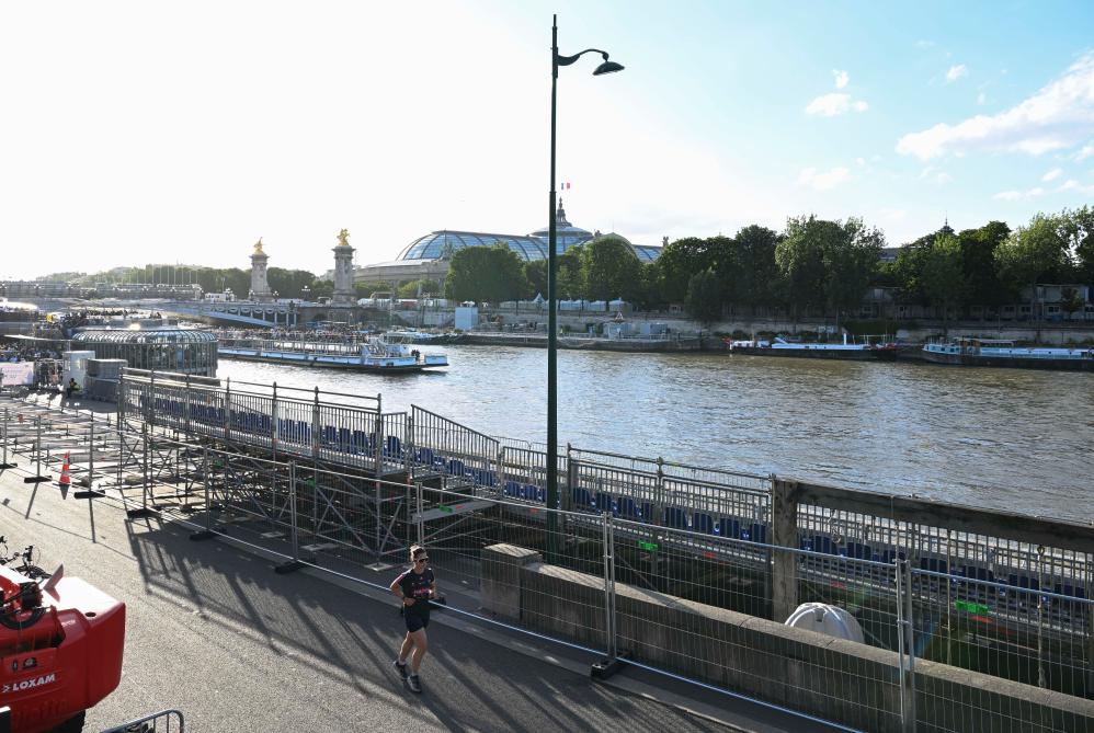 ??這是塞納河畔的開幕式看臺(tái)(7月4日攝)。新華社記者 賀長山 攝
