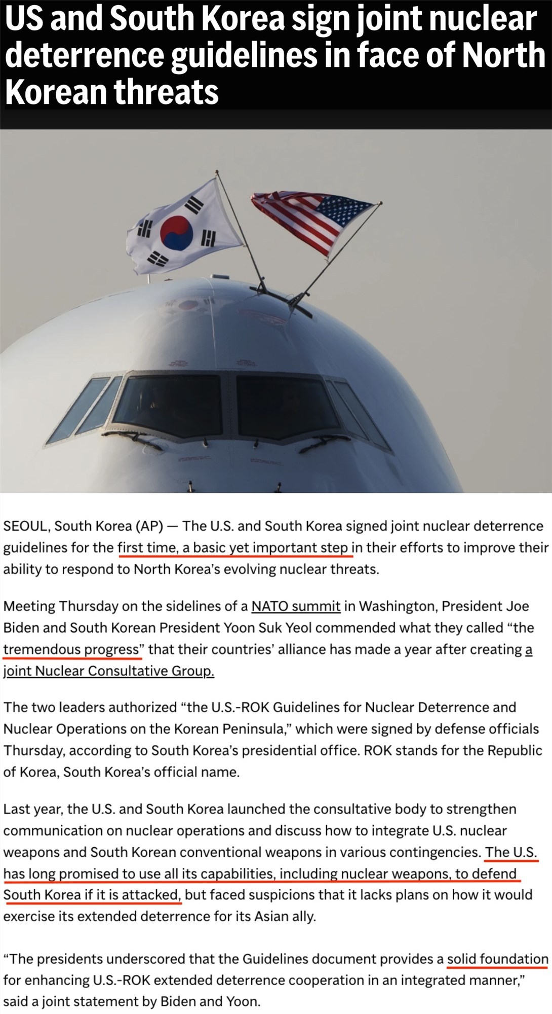 本月11日,在北約華盛頓峰會間隙,美韓兩國國防部官員簽署《美韓關(guān)于朝鮮半島核威懾與核作戰(zhàn)的指導方針》。這也是兩國首次簽署此類文件,被認為是“兩國努力提高應(yīng)對朝鮮核威脅能力的基本且重要的一步”。