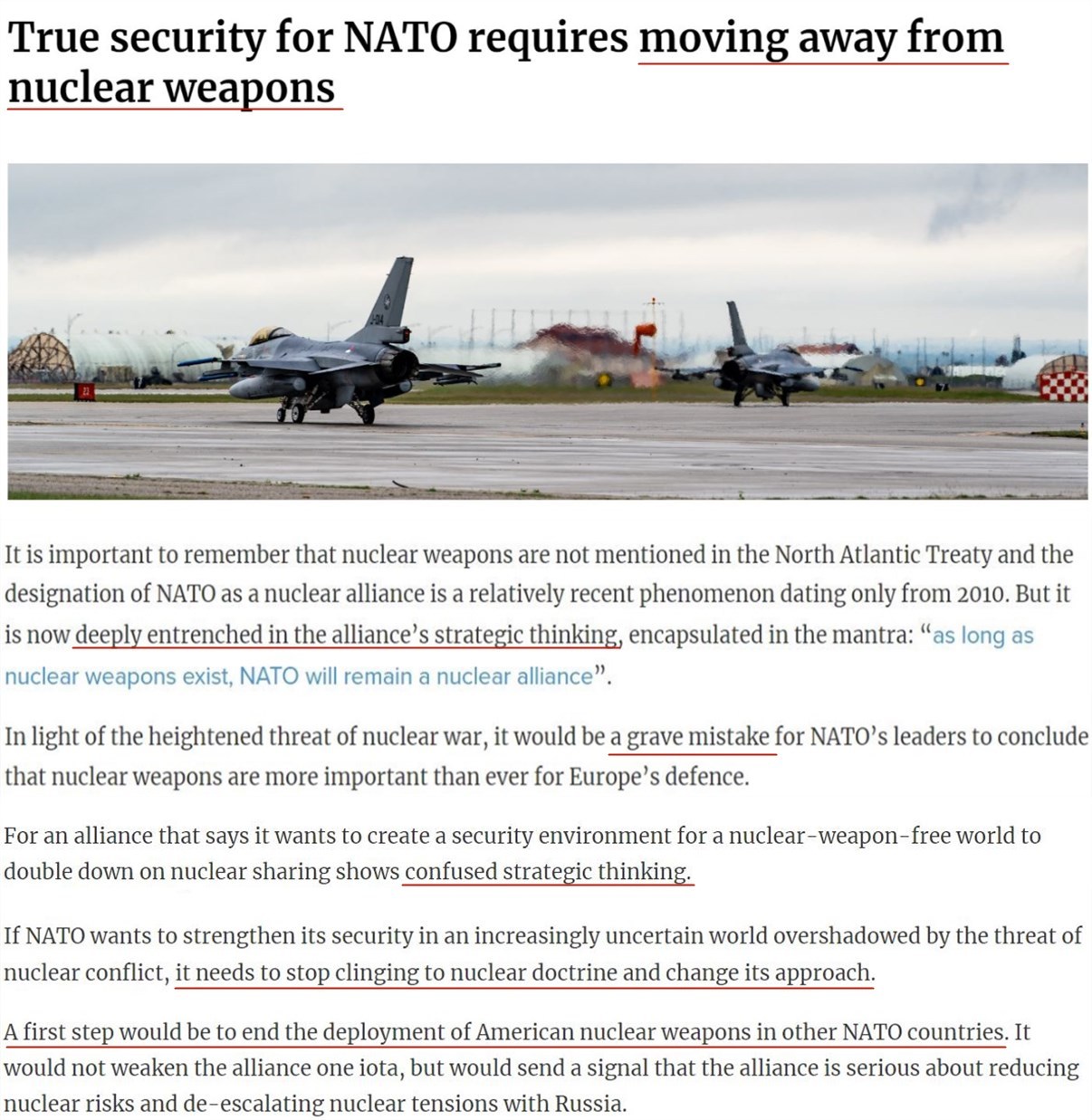 文章指出,《北大西洋公約》中并沒有提到核武器,但如今,它已深深根植于北約的戰(zhàn)略思想之中。鑒于核戰(zhàn)爭危險的加劇,北約領(lǐng)導人如果斷定核武器對歐洲防務(wù)比以往任何時候都重要,那將是一個嚴重的錯誤。