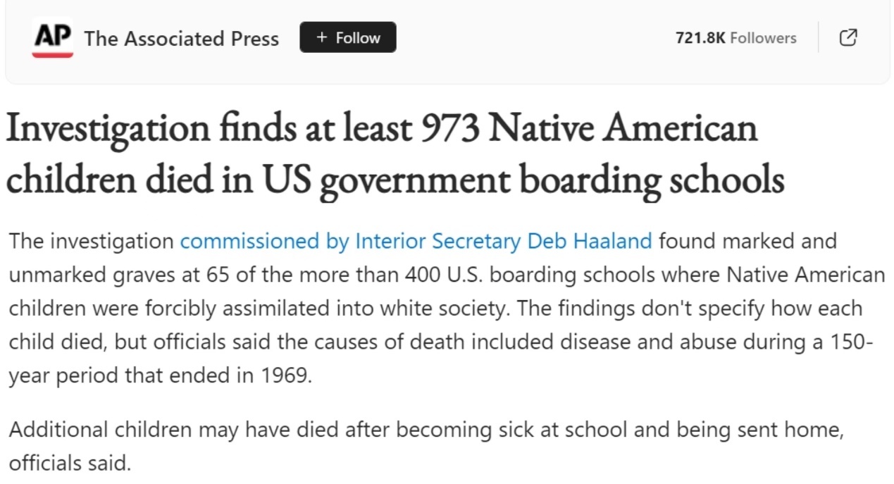 在2021年加拿大境內(nèi)原住民寄宿學(xué)校舊址接連發(fā)現(xiàn)大規(guī)模無標(biāo)記墓穴并引爆全球輿論后,作為加拿大“老師”的美國被自然牽帶而出,曝光于天下。