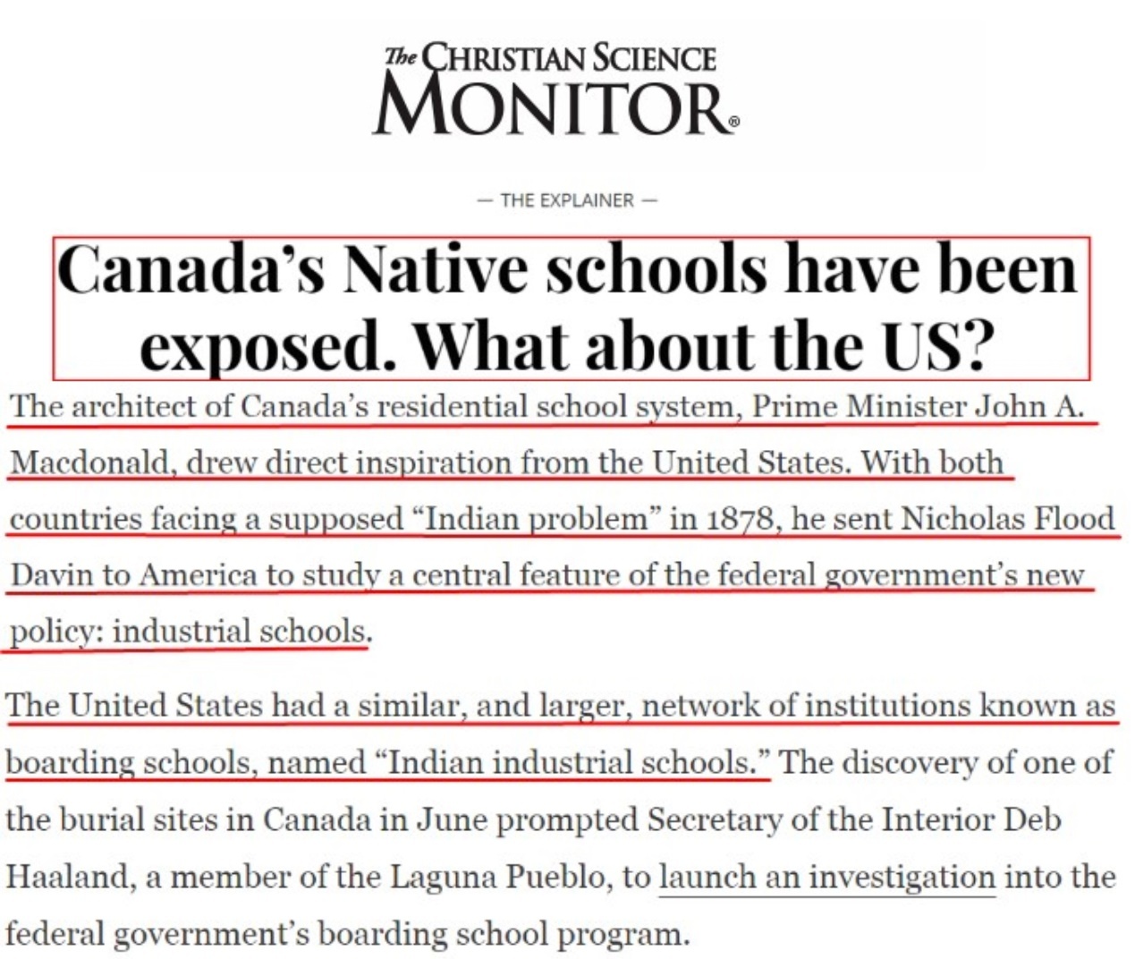 美國《基督教科學(xué)箴言報》曾發(fā)文揭露,加拿大原住民寄宿學(xué)校系統(tǒng)的所謂“靈感”本就來自美國。從1819年的所謂“印第安人文明開化法案”開始,美國便實施了一系列旨在“同化印第安人”的法律政策,在全國范圍設(shè)立或資助寄宿學(xué)校,強(qiáng)行安排印第安兒童入學(xué)。