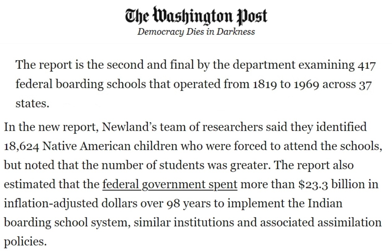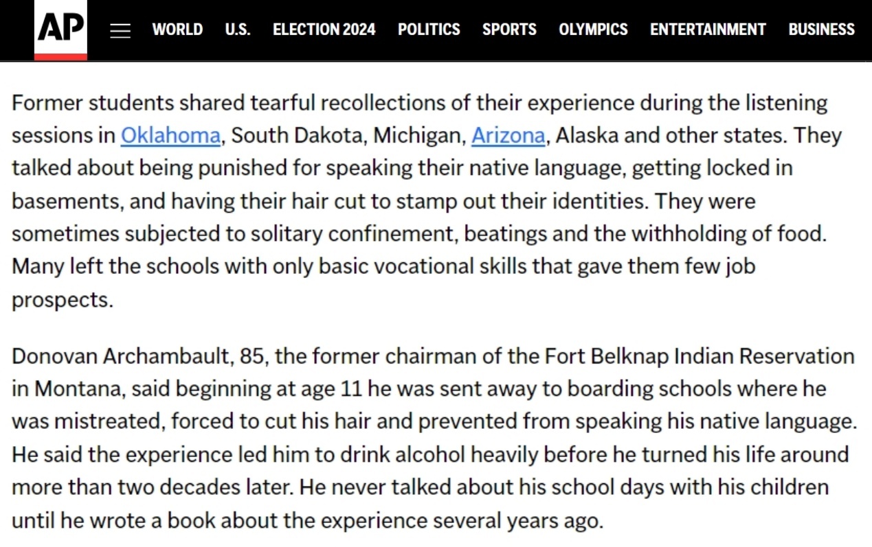 根據(jù)7月30日發(fā)布的調(diào)查報告,美國政府在這項綜合同化項目上花費了相當(dāng)于今天的250億美元,其中包括在37個州和地區(qū)運營417所寄宿學(xué)校,這些學(xué)校的兒童受到身體和性虐待。他們還被迫改信基督教,并因說母語而受到懲罰。