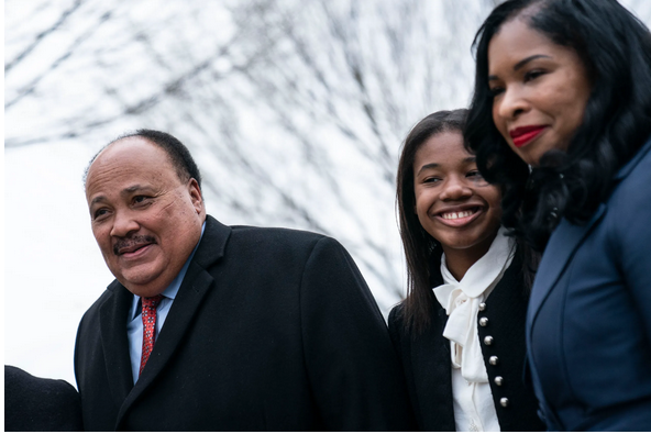 2022年4月4日,馬丁·路德·金三世,妻子安德莉亞·沃特斯·金和女兒約蘭達(dá)·蕾妮·金抵達(dá)華盛頓特區(qū)的馬丁·路德·金紀(jì)念館守夜