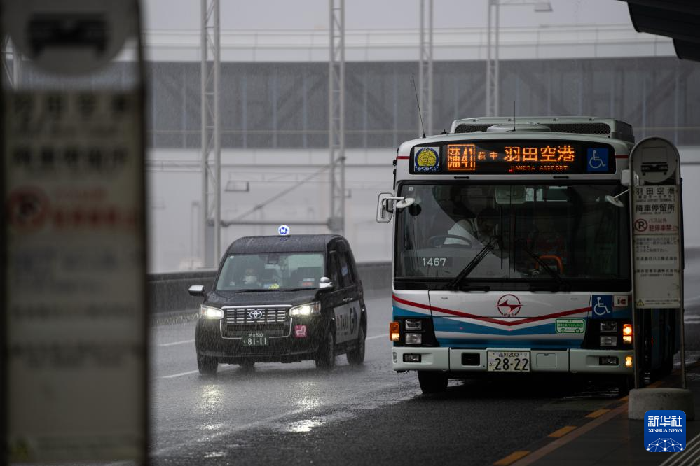 8月16日,在日本東京羽田機(jī)場(chǎng),車(chē)輛行駛在暴雨中。新華社記者 張笑宇 攝