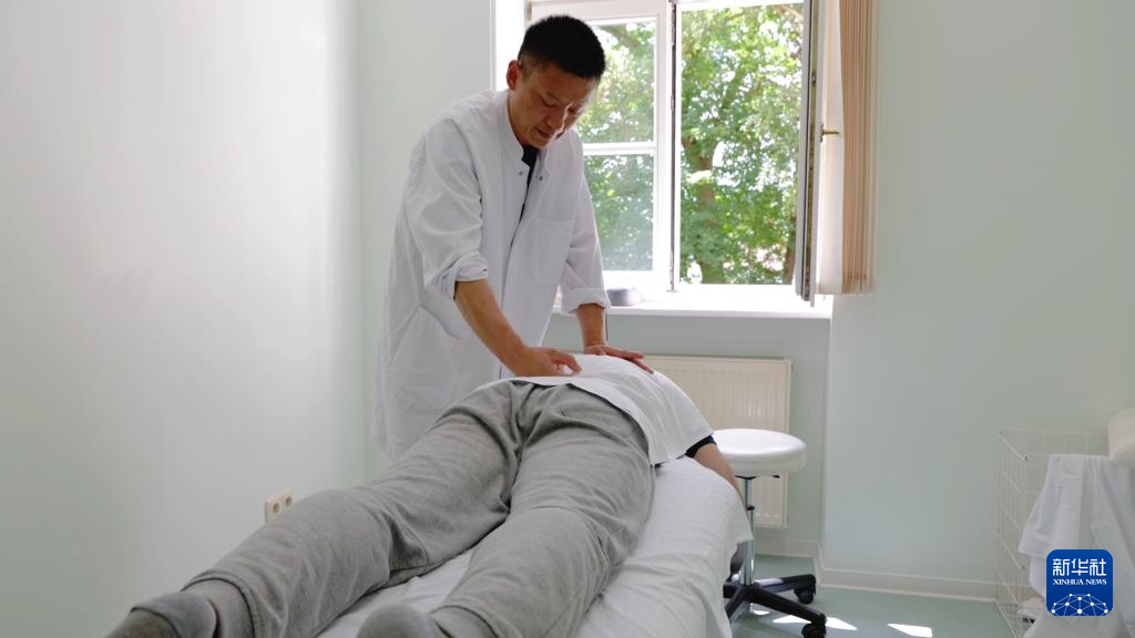 7月11日,在德國(guó)巴伐利亞州巴德魁茨汀,北京中醫(yī)藥大學(xué)魁茨汀醫(yī)院的中醫(yī)醫(yī)生幫病人進(jìn)行推拿治療。 新華社記者 賈金明 攝