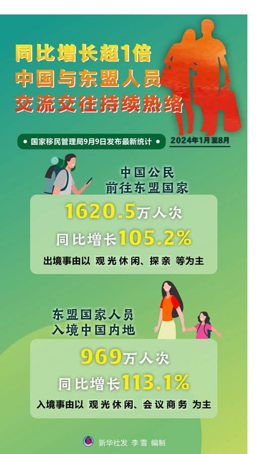 國(guó)家移民管理局9日發(fā)布最新統(tǒng)計(jì),2024年1月至8月,中國(guó)公民前往東盟國(guó)家1620.5萬(wàn)人次,同比增長(zhǎng)105.2%,出境事由以觀光休閑、探親等為主;東盟國(guó)家人員入境中國(guó)內(nèi)地969萬(wàn)人次,同比增長(zhǎng)113.1%,入境事由以觀光休閑、會(huì)議商務(wù)為主。
