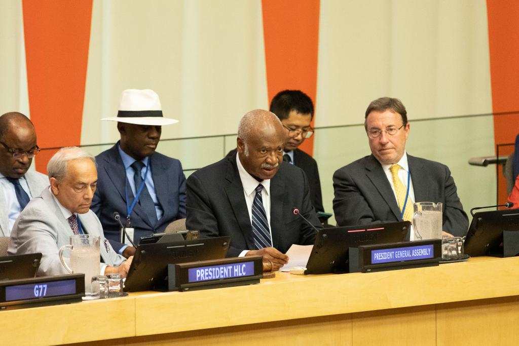 9月12日,在位于紐約的聯合國總部,第79屆聯合國大會主席菲勒蒙·揚(前排中)在聯合國南南合作日高級別討論會上致辭。新華社記者 謝鍔 攝