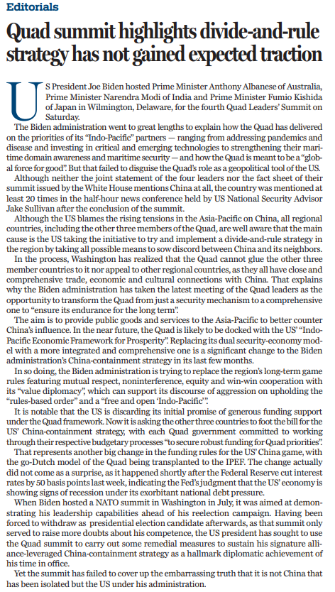原文標題:Quad summit highlights divide-and-rule strategy has not gained expected traction