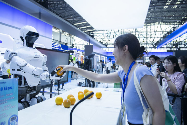 9月20日,在2024世界制造業(yè)大會展館內(nèi),人形機器人“啟江二號”抓取橙子遞給參觀者。新華社記者 黃博涵 攝