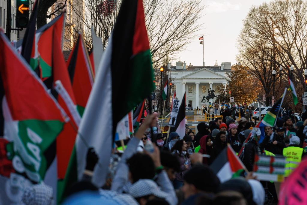1月13日,在美國首都華盛頓,人們參加聲援巴勒斯坦的集會(huì)游行活動(dòng)。大批示威者揮舞旗幟和標(biāo)語,高喊口號(hào)聲援巴勒斯坦,呼吁?;稹P氯A社發(fā)(亞倫攝)