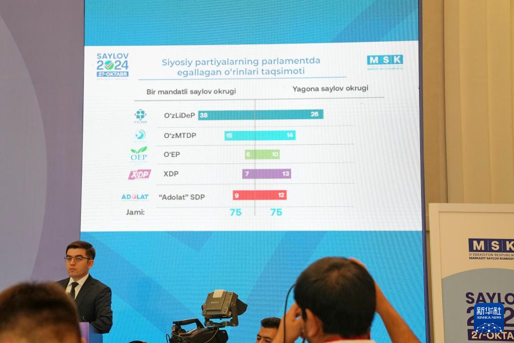 10月28日,烏茲別克斯坦中央選舉委員會(huì)在首都塔什干舉行新聞發(fā)布會(huì)宣布烏最高會(huì)議立法院(議會(huì)下院)選舉初步結(jié)果。新華社發(fā)(扎法爾攝)