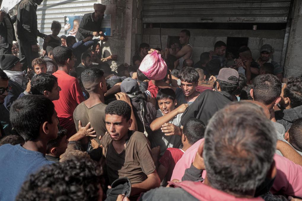 10月23日,人們在加沙地帶北部的加沙城領取救濟食品。新華社發(fā)(馬哈茂德·扎基攝)