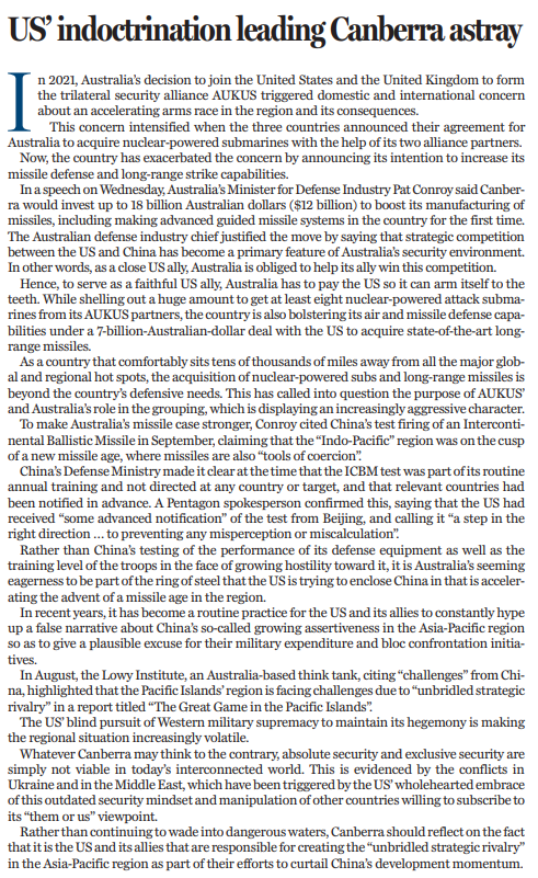 作為一個遠離全球和地區(qū)主要熱點的國家,購買核動力潛艇和遠程導彈超出了澳大利亞的防御需要。這不禁令人對“奧庫斯”的目的以及澳大利亞在其中的作用產(chǎn)生疑問,因為“奧庫斯”表現(xiàn)出越來越強的攻擊性。