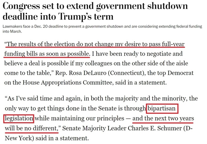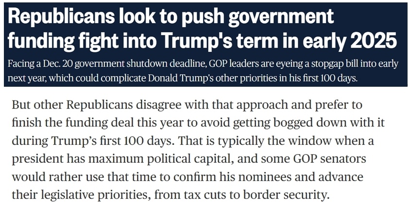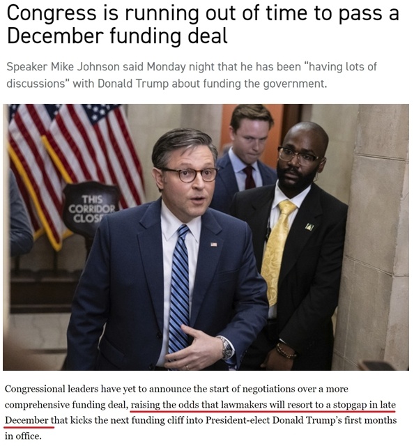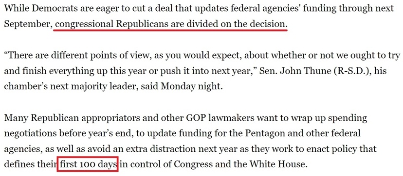 據(jù)報道,不少共和黨議員、特別是負(fù)責(zé)撥款的議員希望在年底前完成新財年的總預(yù)算支出談判,避免給特朗普的新政府明年上任后制定政策時帶來額外干擾,因為這些政策將“決定他們控制國會和白宮的頭100天”。