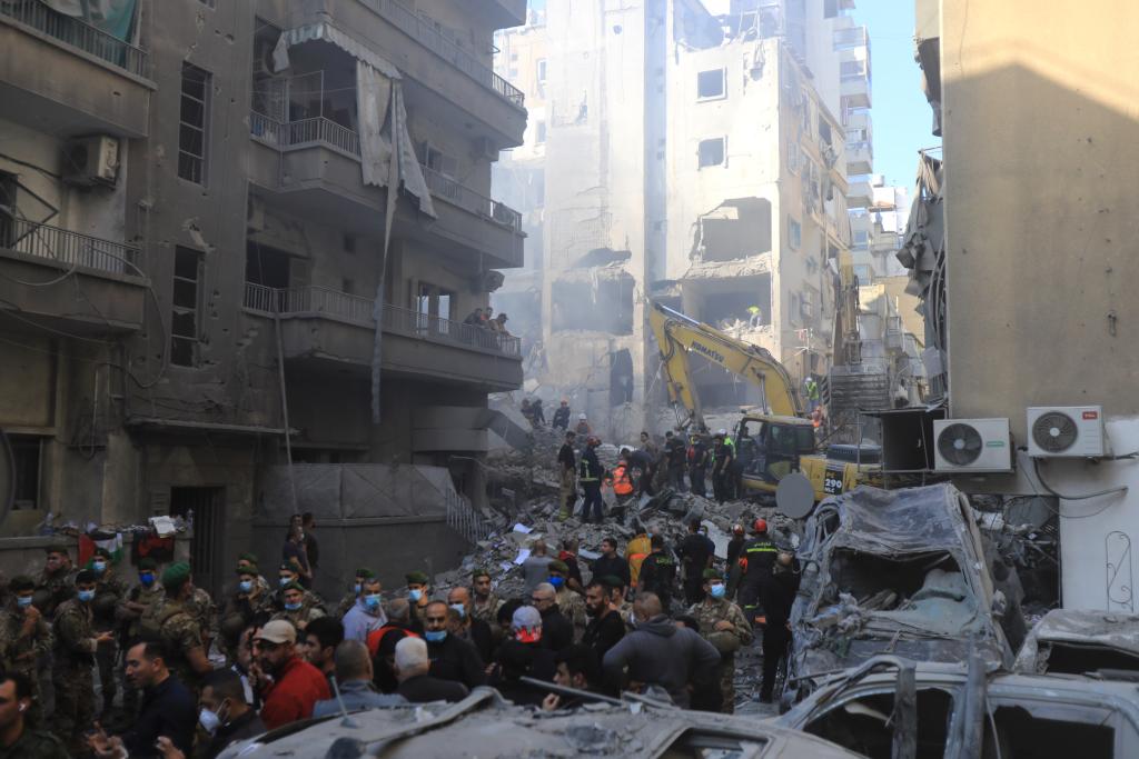 11月23日,在黎巴嫩貝魯特,人們在遭以軍空襲的建筑廢墟參與搜救。新華社發(fā)