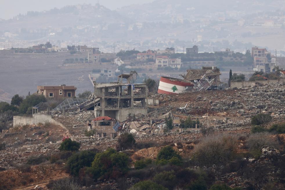 這是11月27日從黎巴嫩和以色列邊境地區(qū)以色列一側(cè)拍攝的黎南部損毀建筑。新華社發(fā)(賈馬爾·阿瓦德攝)