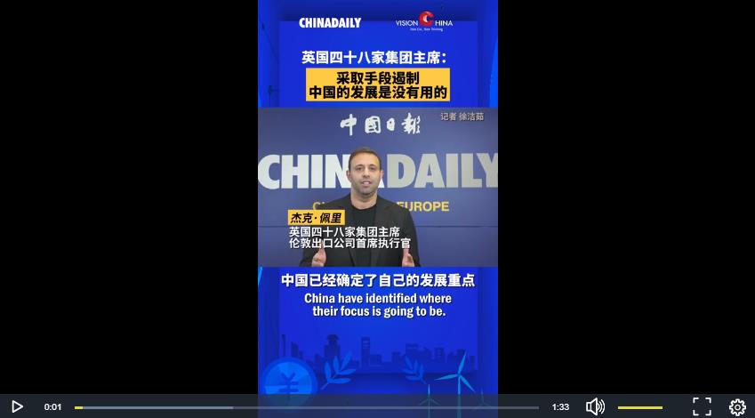 12月5日,由中國日報(bào)社主辦、對外經(jīng)濟(jì)貿(mào)易大學(xué)協(xié)辦的“新時(shí)代大講堂”活動(dòng)在北京舉行。英國四十八家集團(tuán)主席、倫敦出口公司CEO杰克·佩里在視頻演講中提到“對中國發(fā)展采取遏制手段是沒有用的”,他說“中國的各種活動(dòng)和博覽會(huì)邀請了所有人,沒有誰會(huì)被中國拒之門外”。