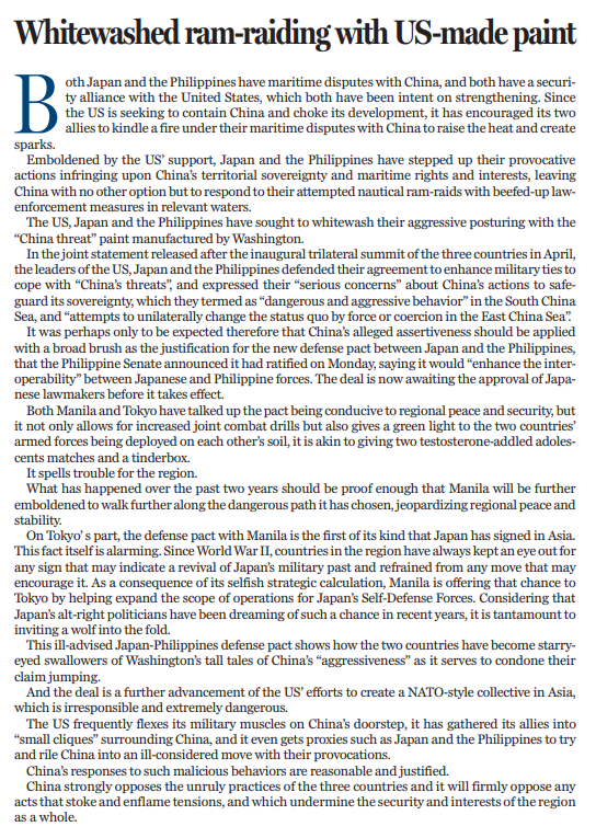 菲律賓和日本都大肆宣揚(yáng)該協(xié)定有利于地區(qū)和平與安全,但實(shí)際上,該協(xié)定不僅允許兩國(guó)間增加聯(lián)合作戰(zhàn)演習(xí),還為兩國(guó)在對(duì)方領(lǐng)土上部署軍隊(duì)開(kāi)了綠燈,這無(wú)異于將火柴和火藥桶交到兩個(gè)荷爾蒙過(guò)剩的青少年手中。