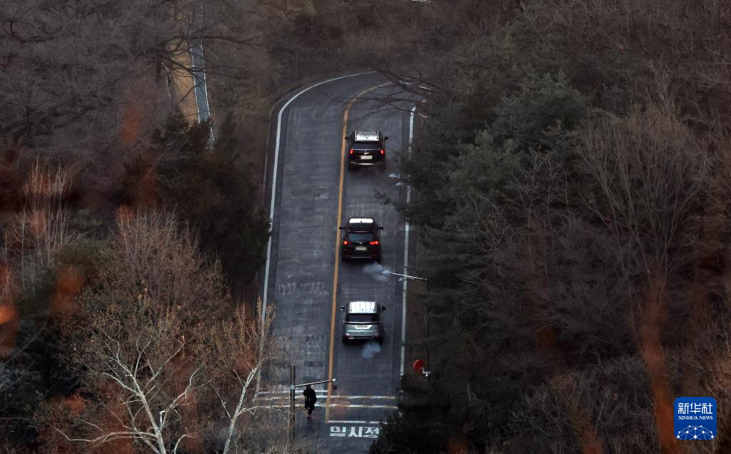 1月3日上午,韓國高級(jí)公職人員犯罪調(diào)查處工作人員乘坐的車輛駛向首爾龍山區(qū)漢南洞的總統(tǒng)官邸。新華社/紐西斯通訊社