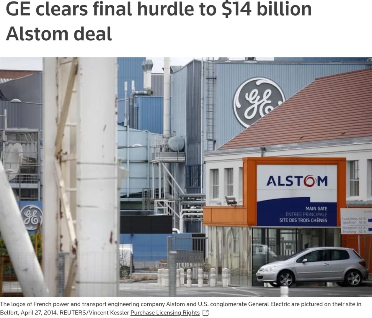 △路透社:2015年9月,美國通用電氣公司掃清了以140 億美元收購阿爾斯通電力設備業(yè)務的最后障礙。