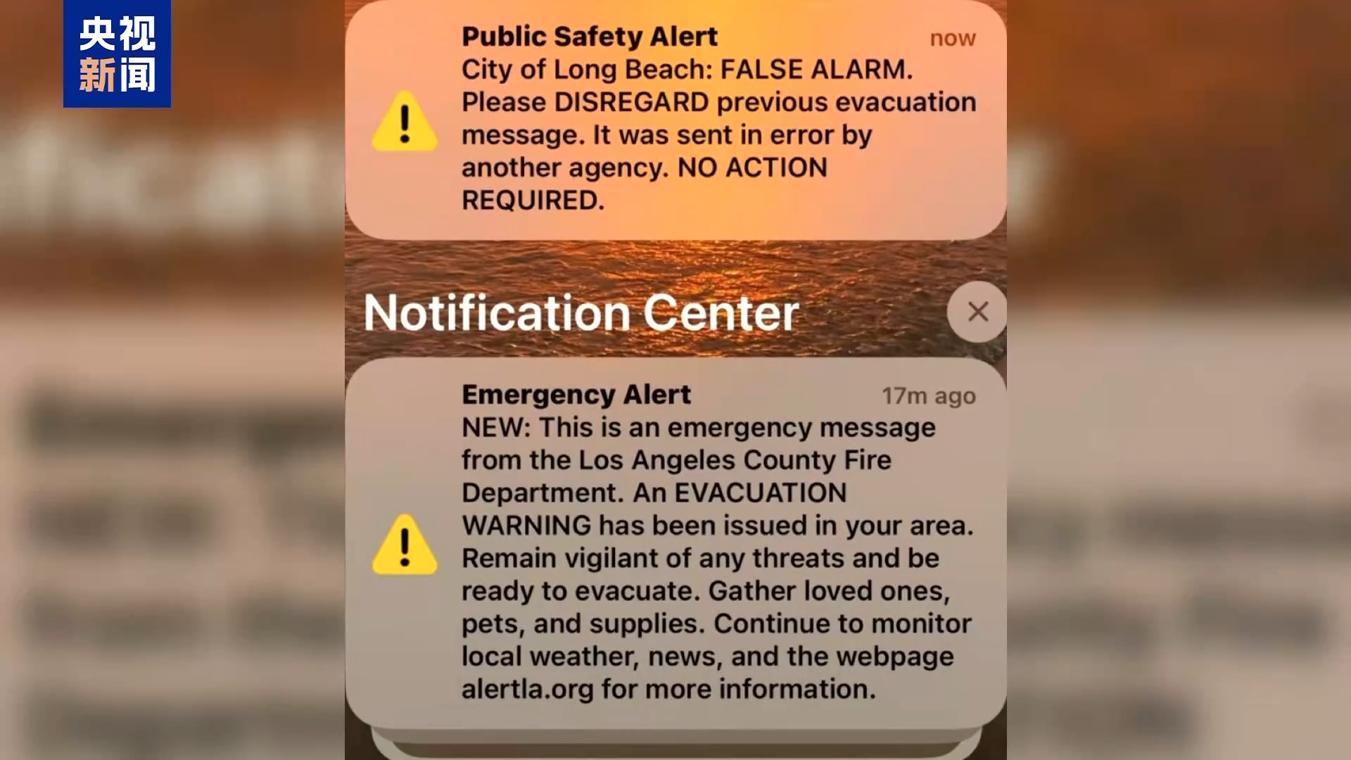 央視記者 劉驍騫:與此同時(shí),根據(jù)我在一線的觀察,人為造成的災(zāi)害正在出現(xiàn)。首先,洛杉磯縣的警報(bào)發(fā)布系統(tǒng)嚴(yán)重失靈,造成撤離信息的混亂。一般情況下,如果你所在的區(qū)域處于撤離預(yù)警或者需要立刻撤離的范圍內(nèi),手機(jī)就會(huì)收到由洛杉磯縣發(fā)布的政府警報(bào)。第一次發(fā)生警報(bào)失靈的情況是10日3時(shí)左右,我的手機(jī)發(fā)出巨大的警報(bào)聲,短信內(nèi)容顯示“我居住的區(qū)域需要立刻撤離”,但是我打開(kāi)窗,發(fā)現(xiàn)室外并沒(méi)有煙味,我立刻登錄了另外幾個(gè)災(zāi)難預(yù)警app,也沒(méi)有發(fā)現(xiàn)周遭有新的山火出現(xiàn)。幾乎在同一時(shí)間,很多生活在洛杉磯不同區(qū)域的網(wǎng)友都表示收到了這條警報(bào)。在10日的白天,類(lèi)似的錯(cuò)誤警報(bào)幾乎每隔幾小時(shí)就出現(xiàn)一次,普通居民也從一開(kāi)始收到警報(bào)時(shí)的緊張,變成麻木,有的人為了避免過(guò)于焦慮,甚至在手機(jī)設(shè)置中關(guān)掉了政府警報(bào)通知。