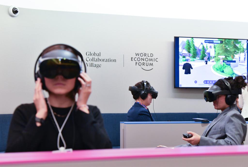 1月23日,在瑞士達(dá)沃斯,與會者借助VR設(shè)備沉浸式參加世界經(jīng)濟(jì)論壇2025年年會。新華社記者連漪攝