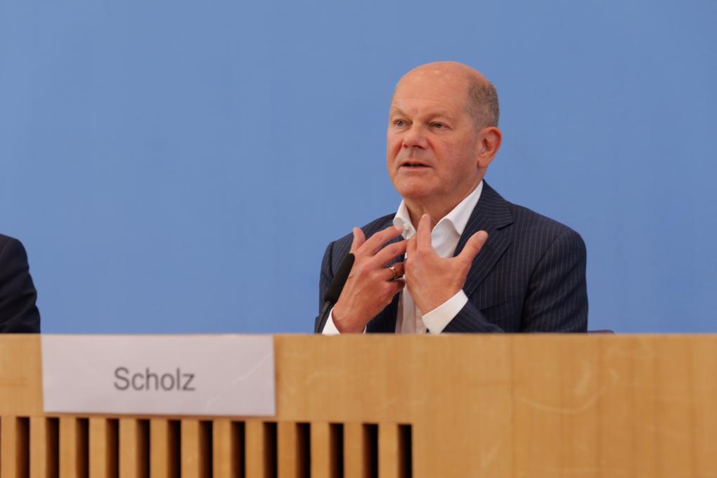 2024年7月24日,德國(guó)總理朔爾茨在柏林舉行的新聞發(fā)布會(huì)上講話。新華社記者李函林?jǐn)z