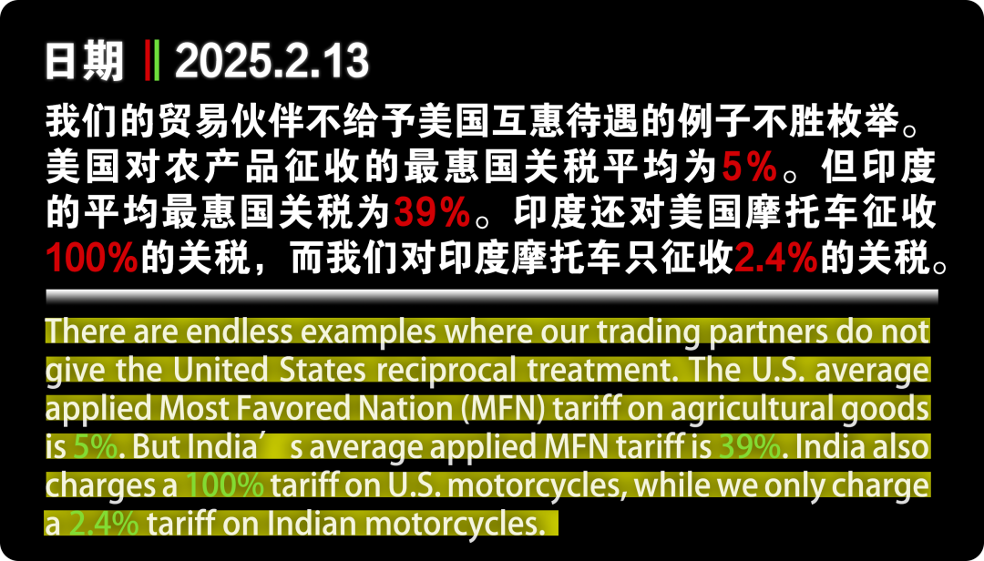 當(dāng)?shù)貢r(shí)間2月13日,特朗普宣布了最新的關(guān)稅決定:在未來幾周或幾個(gè)月內(nèi)對(duì)其他國家加征“對(duì)等關(guān)稅”。這意味著,美國的貿(mào)易伙伴,全部面臨著新的關(guān)稅威脅。