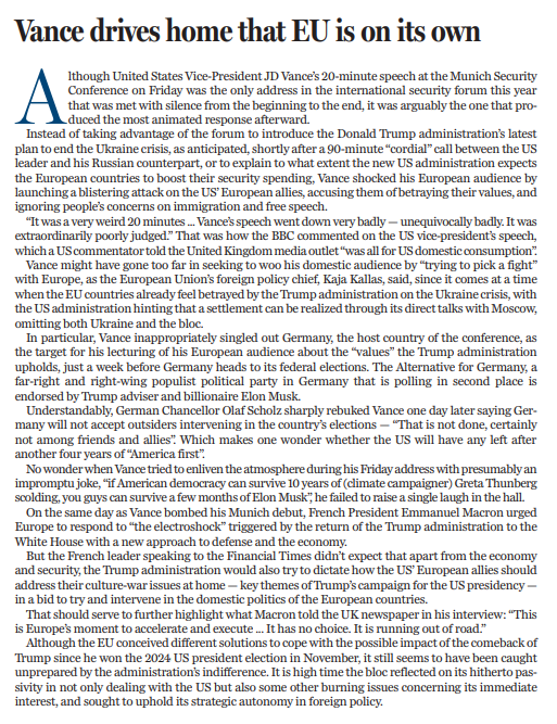 就在萬(wàn)斯的慕尼黑之行“翻車”之際,法國(guó)總統(tǒng)馬克龍?jiān)诮邮堋督鹑跁r(shí)報(bào)》采訪時(shí)呼吁歐洲加快行動(dòng),以新的國(guó)防和經(jīng)濟(jì)政策應(yīng)對(duì)特朗普政府回歸白宮所帶來的“電擊式?jīng)_擊”。但馬克龍可能沒想到,特朗普政府不僅在經(jīng)濟(jì)和安全問題上向歐洲施壓,還試圖對(duì)歐洲國(guó)家如何處理國(guó)內(nèi)文化戰(zhàn)爭(zhēng)問題指手畫腳。萬(wàn)斯的演講表明,美國(guó)政府甚至有意介入歐洲國(guó)家的內(nèi)政。正如馬克龍所言:“歐洲已經(jīng)別無選擇,歐洲已經(jīng)快無路可走了?!?/p>